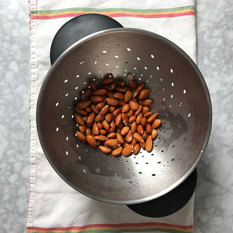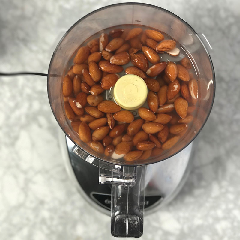 - Soak almonds in water overnight in covered bowl then drain and rinse